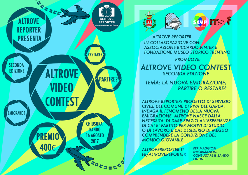 Il progetto Altrove del Comune di Riva del Garda e l'associazione culturale Riccardo Pinter, in collaborazione con la Fondazione Museo storico del Trentino, indicono la seconda edizione del concorso video Altrove Video Contest. Anche quest’anno, gli obiettivi sono valorizzare la creatività nell'ambito del prodotto audiovisivo, dare voce alle visioni che i giovani hanno sulla tematica della nuova emigrazione e sensibilizzare la cittadinanza al tema.