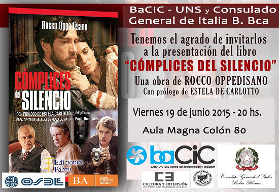 El día viernes 19 de junio 2015, a las 20 hs, en la Aula Magna de la Universidad Nacional del Sur, en av. Colon 80, tendrá lugar la presentación del libro “cómplices del silencio”, una obra de Rocco Oppedisano, con prólogo de Estela de Carlotto.